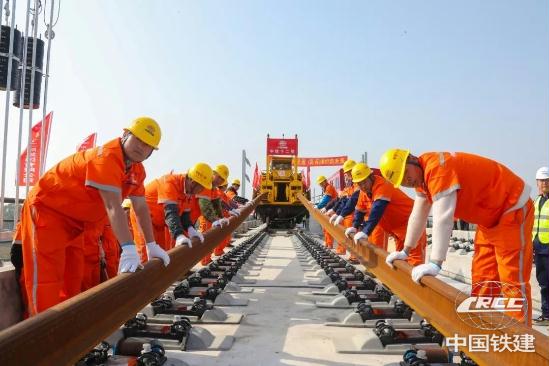 為優質高效完成全線鋪軌任務,建設者提前在位于荊州站北側的鋪軌基地儲存長鋼軌,以鋪軌基地為起點,采用TC-500型鋪軌機由荊州站一路向北鋪設長鋼軌;加持智能行車調度指揮系統,全天候對鋪軌機、長軌運輸車、焊軌車等設備的運行狀態及作業位置進行監控和統一調度指揮,保證了交叉施工安全有序,并且提高了鋪軌速度,每日單向鋪軌可達6公里。